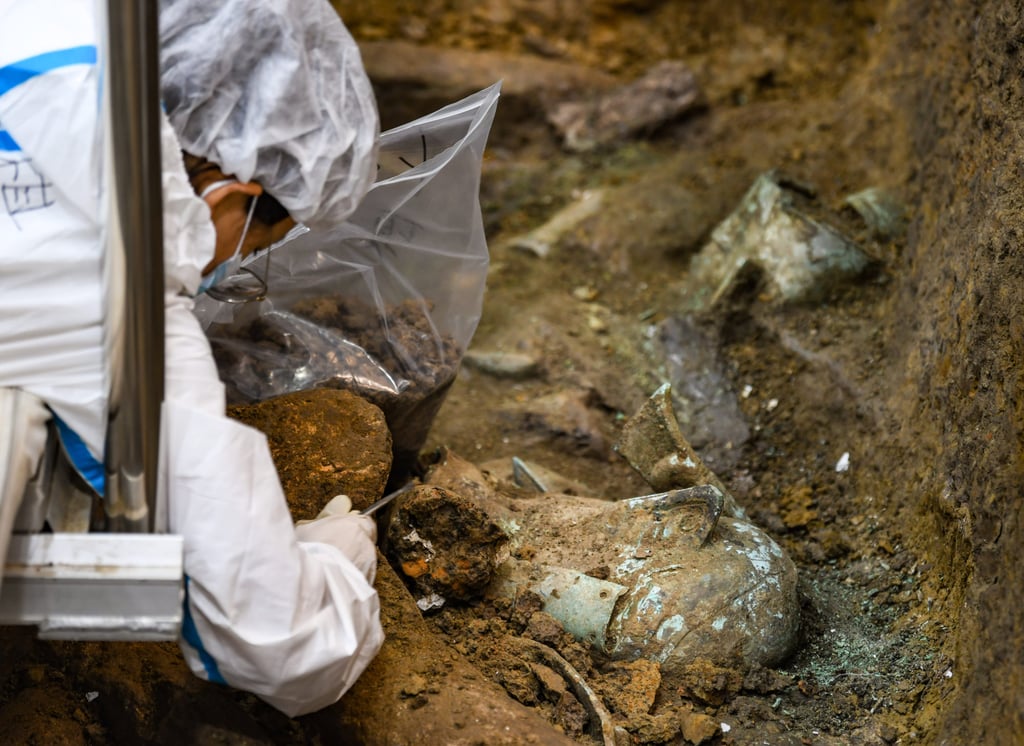 Археолог работи в жертвената яма на руините № 8 на 2 септември 2021 г. Снимка: Синхуа