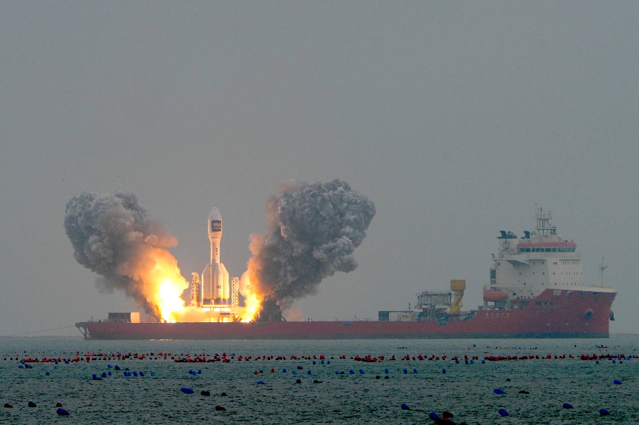 Ракета носител Gravity-1, носеща сателит с широко поле и два експериментални спътника, излита от водите край бреговете на Haiyang, провинция Шандонг в Източен Китай, 11 октомври 2025 г. [Photo/Xinhua]