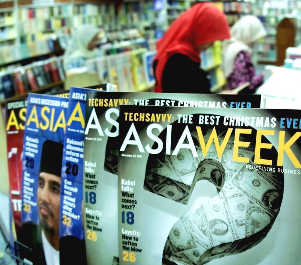 Жените четат книги зад списанията „AsiaWeek“, изложени в книжарница в Куала Лумпур през ноември 2001 г. Снимка: AP