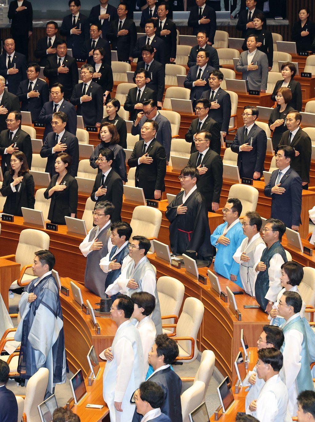 Законодателите участват в пленарна сесия в Народното събрание в Сеул на 1 септември. Някои депутати от опозицията повдигнаха въпросите за сигурността и безопасността по схемата за без визи за Южна Корея за китайските туристически групи. Снимка: EPA/Yonhap